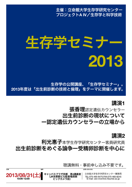 Ars Vivendi Seminar is an extension lecture of ars vivendi (i.e., art of living). In academic year 2013 we focus on “technology and ethics on prenatal diagnosis” and invite two professionals in the field.