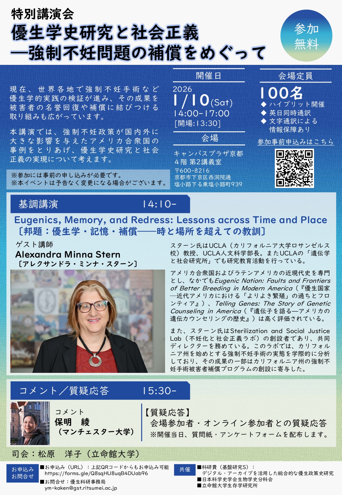 本講演では、強制不妊政策が国内外に大きな影響を与えたアメリカ合衆国の事例をとりあげ、優生学史研究と社会正義の実現について考えます。